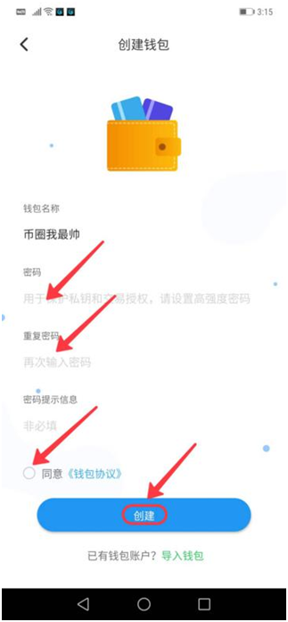 第三步、安装成功后,设置钱包名称,然后创建钱包,(注:首次注册不要导入钱包)如下图: